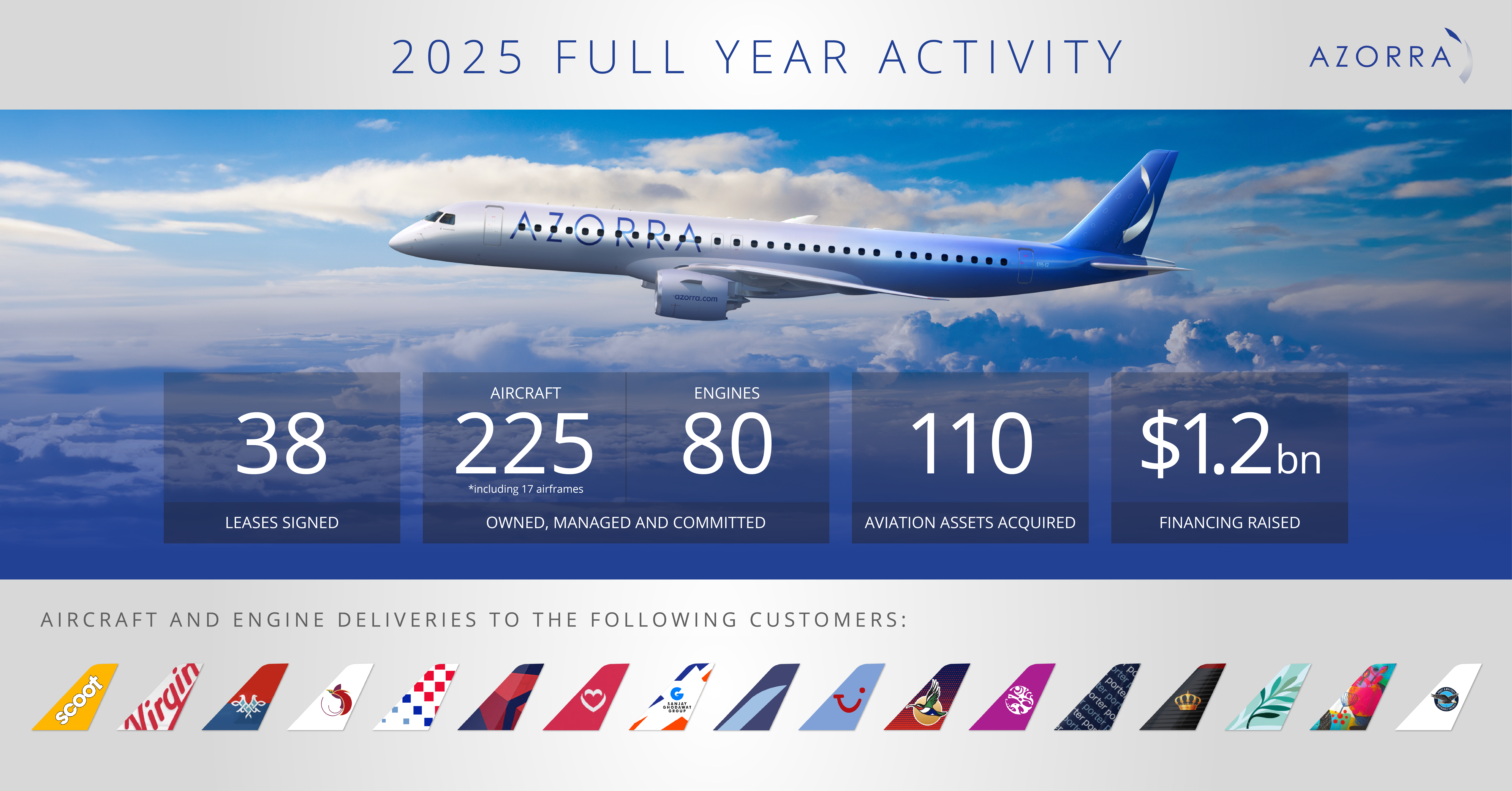 Azorra Aviation Holdings, LLC (“Azorra”) is today announcing the signing of a Sale and Purchase Agreement (SPA) with JetBlue for the acquisition of 13 Embraer E190 airframes and 36 General Electric CF34-10E6 engines.